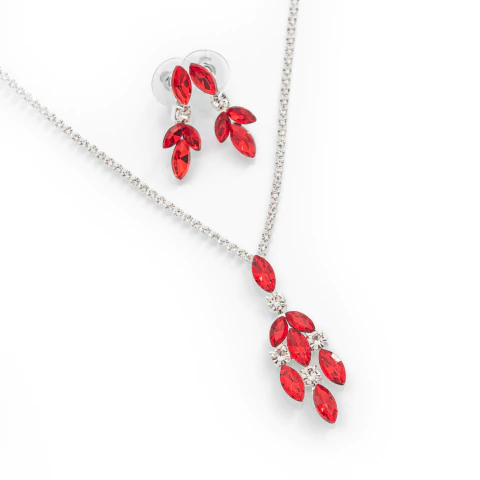 Conjunto Premium confeccionado con Piedras Strass de Cristal en color Transparente / Rojo, y aleación de metales con Baño de Plata. Gracias a esto la diferencia en la calidad y el brillo que poseen. Son libres de Níquel, por lo que es poco probable que genere alergia. Su diseño: Gargantilla 50cm de largo con posibilidad de adaptar a más corto hasta los 40cm, diseño con Dije forma de Ramita con Dijes Oval colgantes de 4cm de alto con Piedras facetadas, y Aros haciendo juego de 3cm de largo, pasantes, colgantes. Cierre con Gancho Mosquetón.